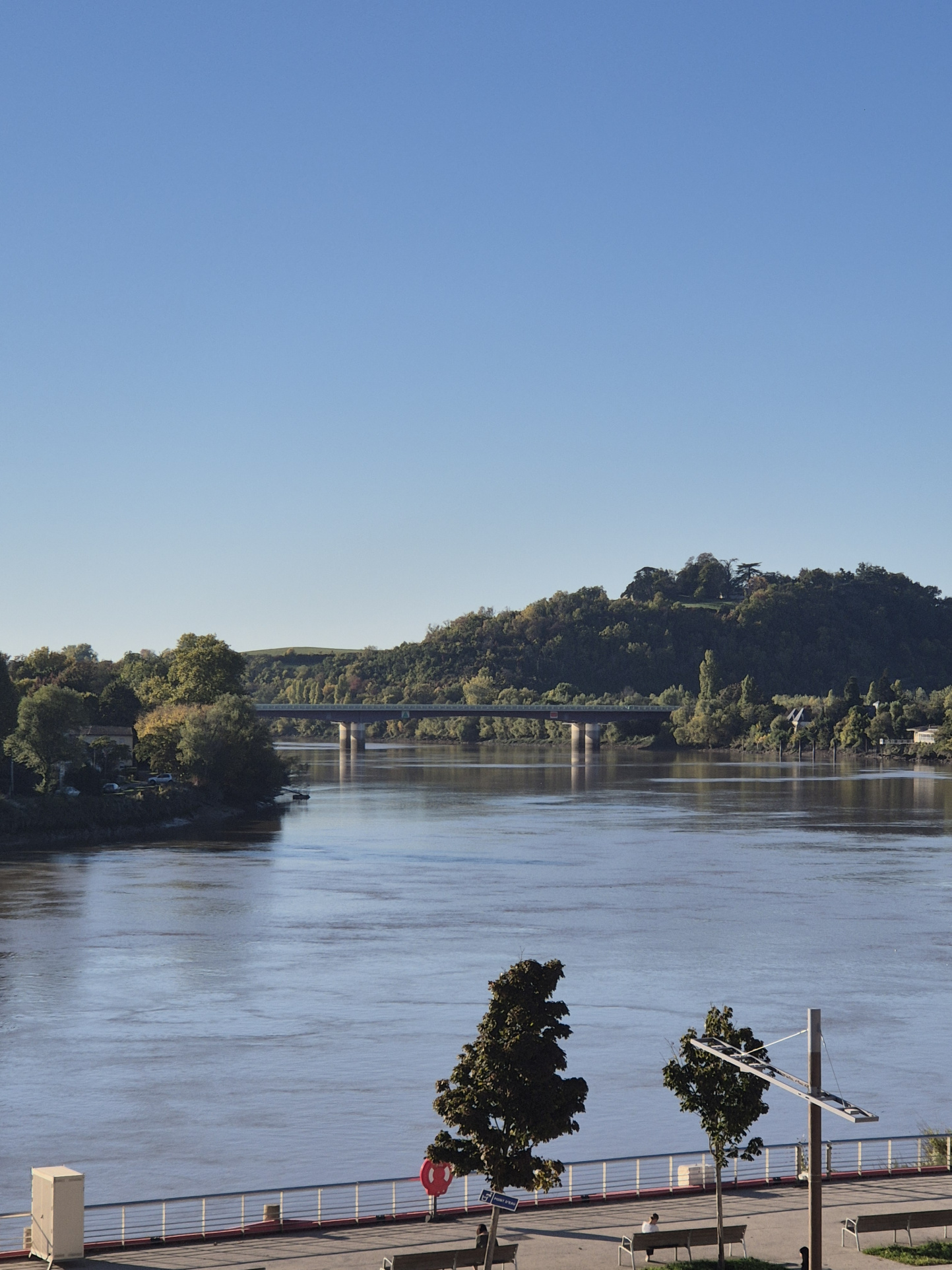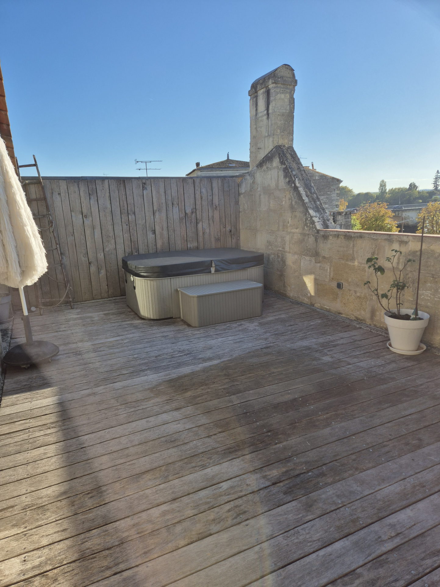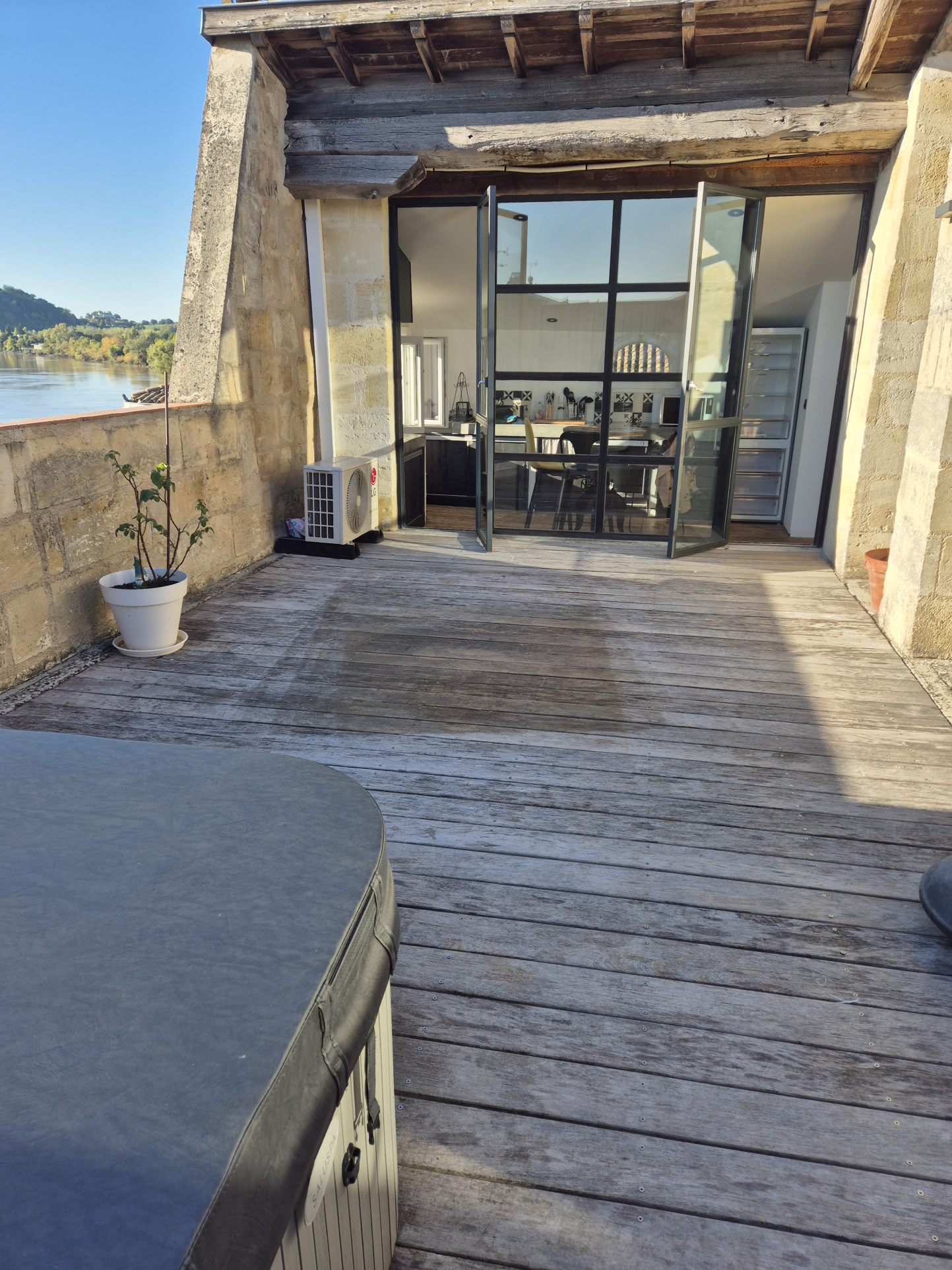 Terrasse de 25 m2 avec jaccuzzi. Vue imprenable sur la rivière et les hauteurs de Fronsac.